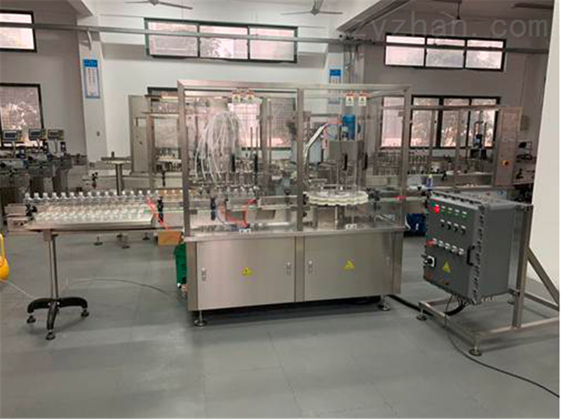 防爆液体灌装旋盖机:本设备使用于塑料瓶,玻璃瓶的灌装,上盖,封口作业。可满足口服剂,外用剂等剂型的生产需要,也可用于农药,化妆品,食品等行业的灌装封口作业。本机有直线式和直角式两种类型,更广泛的使用于不同条件的生产场地。采用快卡式不锈钢泵,灌装精确,拆卸消毒方便。恒扭矩旋盖,气动保护装置,保证封口的密闭性。可选配液面检测,封口密闭检测系统,安全防护性能好。